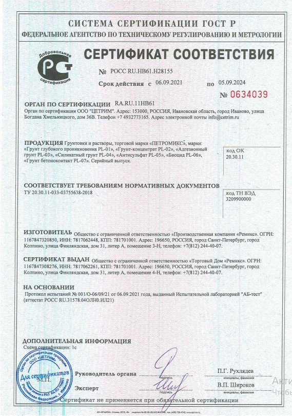 Грунт-концентрат ПЕТРОМИКС PL-02 также обладает отличной адгезией к различным материалам, включая бетон, дерево, металл и другие. Это делает его универсальным средством, которое можно использовать для подготовки поверхности практически любого объекта.